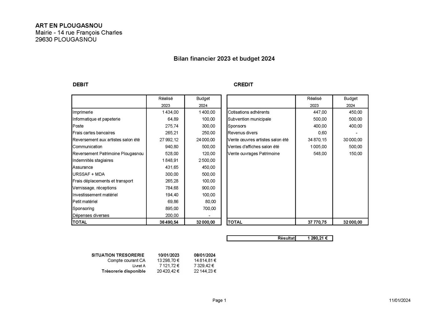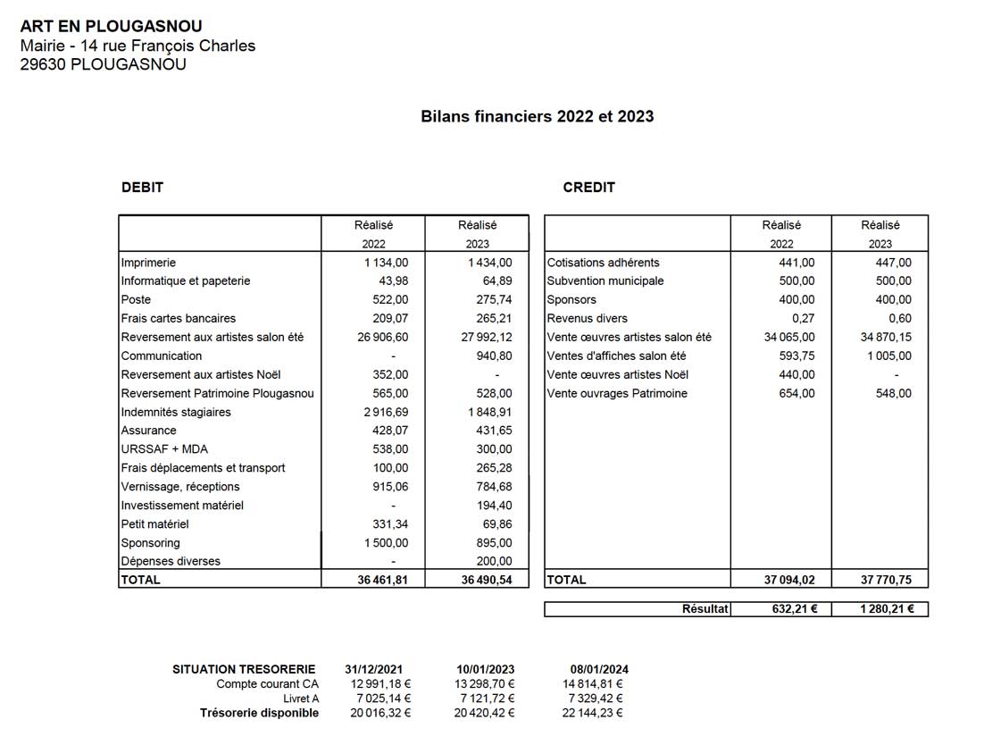 Sur le premier tableau , bilan de l’année 2023 : un record de ventes (environ 35000 euros), une augmentation du poste imprimerie due à la réimpression de cartes postales des précédents salons. L'indemnité globale accordée au stagiaire est minorée du fait de la prise en compte des charges sociales dans le cadre d'une convention avec l'université. Le « sponsoring » correspond pour une bonne part au don de 500 euros pour la réalisation du film réalisé par Marie Halopeau sur le travail de Jean-Pierre et Maryvonne Garrault et pour une autre part au financement du voyage à Brest des élèves du collège de Plougasnou. La vente des affiches a pratiquement doublé notamment grâce au sujet du tableau de Hervé Chateau (Le Marché de Morlaix). En 2023 , Art en Plougasnou n’a pas participé au Marché de Noël. En « communication » Art en Plougasnou a publié un article promouvant le Salon dans le journal professionnel ARTENSION dans un numéro spécial consacré à l’Art contemporain en Bretagne ( 940,80 euros) Donc, un bilan positif de près de 1300 euros pour l’association.
